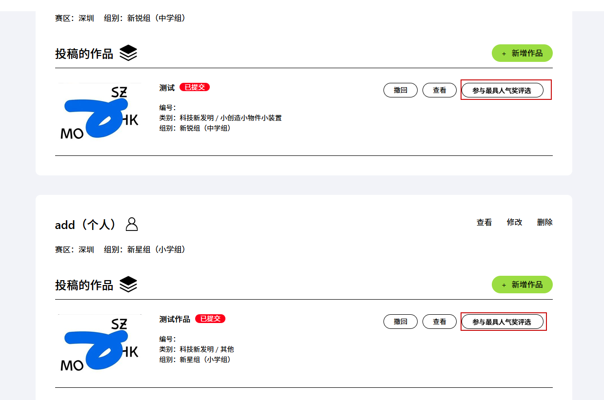 点击"我的投稿"-->"+添加团队/个人参赛者",填写完参赛者信息并保存后,在"我的投稿"栏目中会出现刚刚创建的参赛者信息,右侧点击"+新增作品"即可开始投稿。