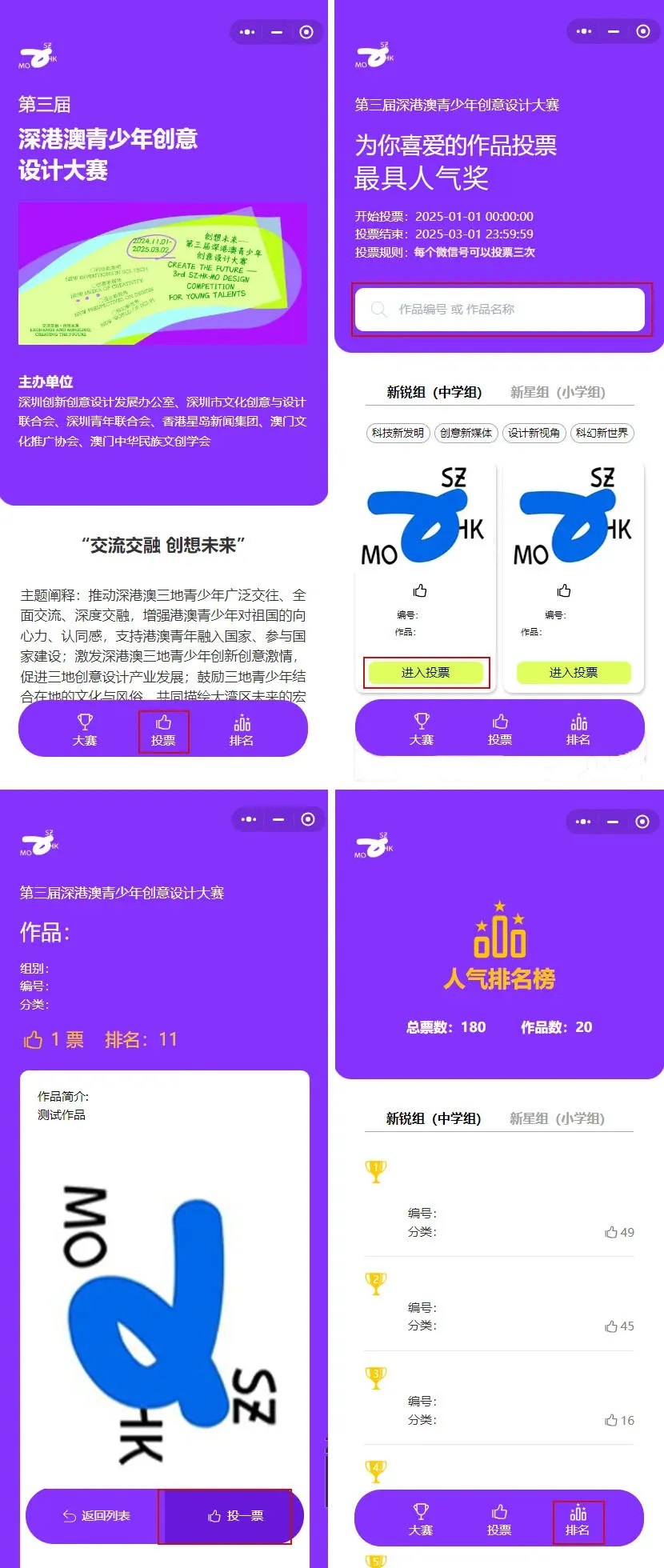 所有参评“最具人气奖”的作品会出现在投票小程序中,供大众评委自行浏览。也可以在小程序搜索对应作品编号或通过分类来查看作品,为自己喜欢的作品投票。在“排名”界面可以查看当前投票的人气排名。
