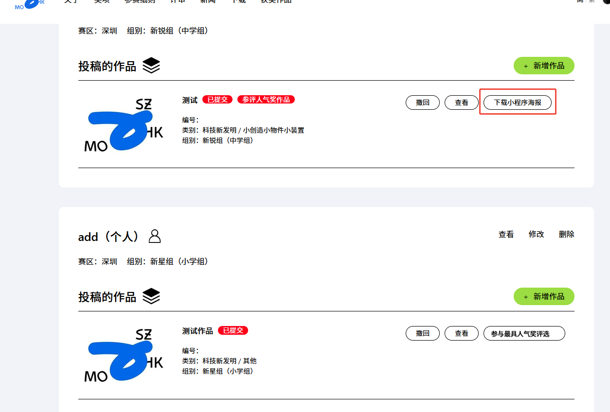 同意参与评选后,系统会自动为您生成小程序海报,点击“下载小程序海报”将您的作品分享给他人。